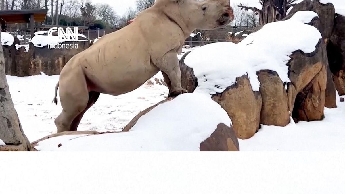 Empat badak putih tampak menikmati salju saat berjalan-jalan di Kebun Binatang Knoxville, Tennessee, Amerika Serikat, pada Selasa (3/2).