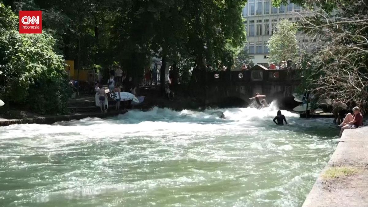 Sementara itu, di Munich, warga memadati Eisbachwelle, Tempat selancar alami di taman English Garden.